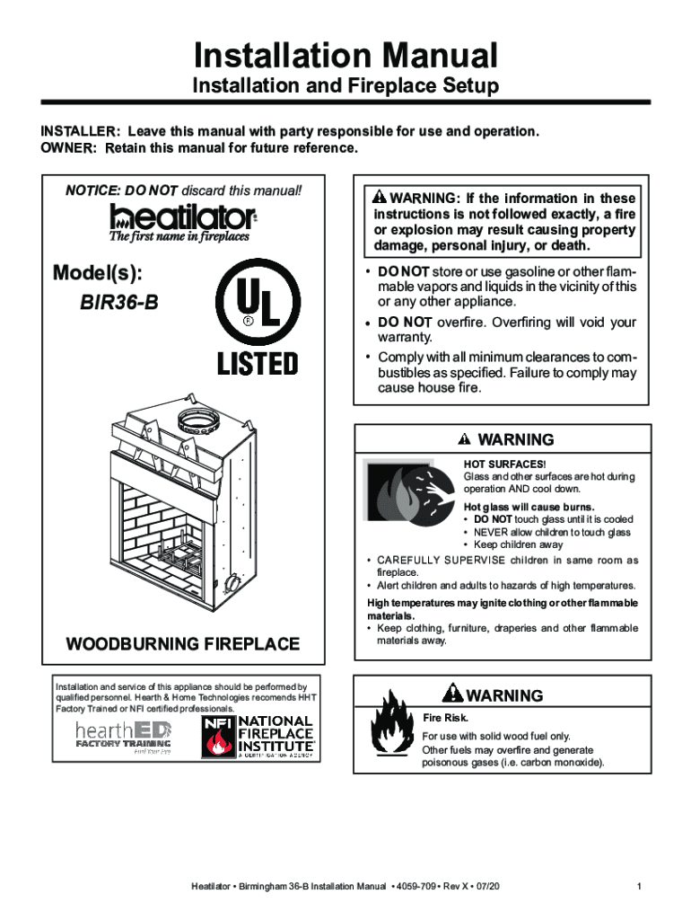 Installation ManualInstallation and Fireplace Setup INSTALLER: Leave this manual with party responsible for use and operation. OWNER: Retain this manual for future reference. NOTICE: DO NOT discard