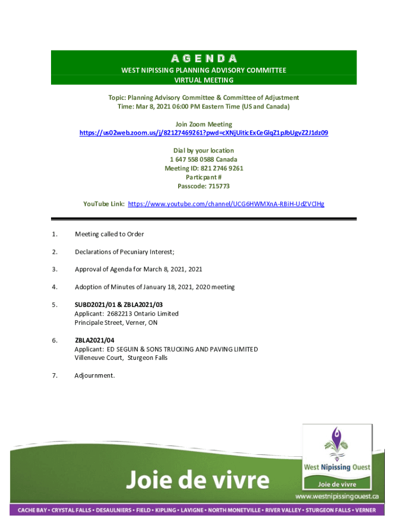AGENDA WEST PISSING PLANNING ADVISORY COMMITTEE VIRTUAL MEETING Topic: Planning Advisory Committee & Committee of Adjustment Time: Mar 8, 2021 06:00 PM Eastern Time (US and Canada) Join Zoom Meeting
