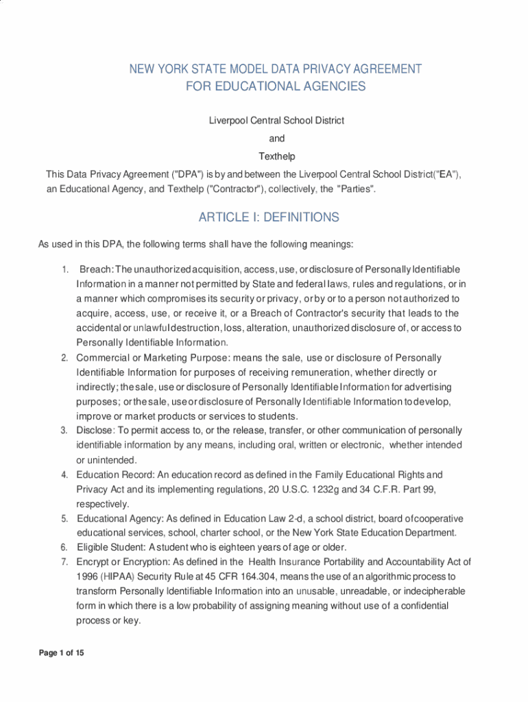 NEW YORK STATE MODEL DATA PRIVACY AGREEMENT FOR EDUCATIONAL AGENCIES Liverpool Central School District and Text help This Data Privacy Agreement (\” DPA\”) is by and between the Liverpool Central