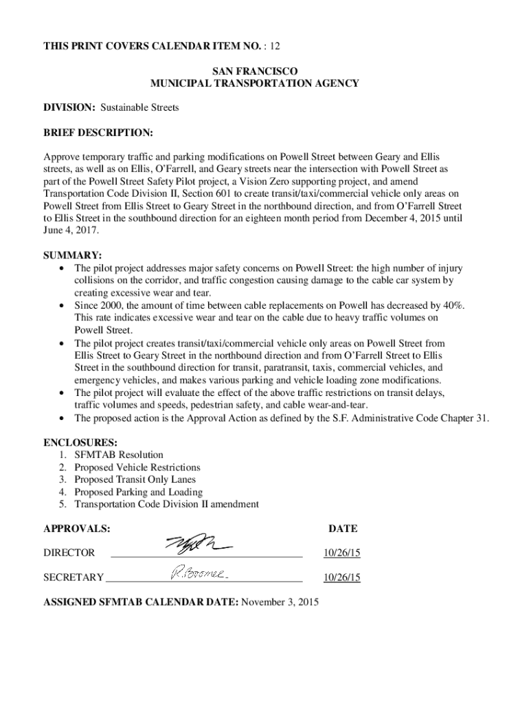 THIS PRINT COVERS CALENDAR ITEM NO. 12 SAN FRANCISCO MUNICIPAL TRANSPORTATION AGENCY DIVISION: Sustainable Streets BRIEF DESCRIPTION: Approve temporary traffic and parking modifications on Powell