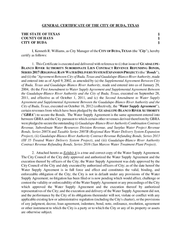 GENERAL CERTIFICATE OF THE CITY OF BUD, TEXAS THE STATE OF TEXAS COUNTY OF HAYS CITY OF BUD I, Kenneth R. Williams, as City Manager of the CITY OF BUD, TEXAS (the \” City\”), hereby certify as