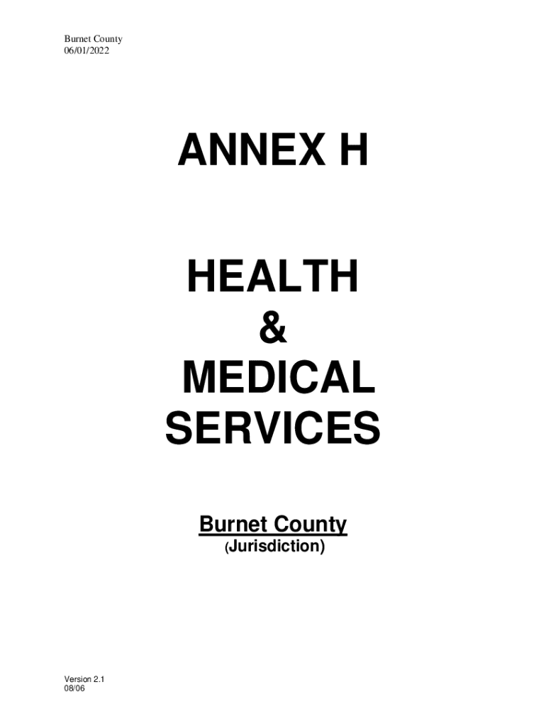 Burned County 06/01/2022ANNEX H HEALTH & MEDICAL SERVICES Burned County (Jurisdiction)Version 2.1 08/06Burnet County 06/01/2022APPROVAL & IMPLEMENTATION Annex H Health & Medical servicesThis annex