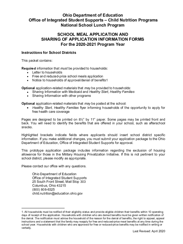Ohio Department of Education Office of Integrated Student Supports Child Nutrition Programs National School Lunch Program SCHOOL MEAL APPLICATION AND SHARING OF APPLICATION INFORMATION FORMS For the