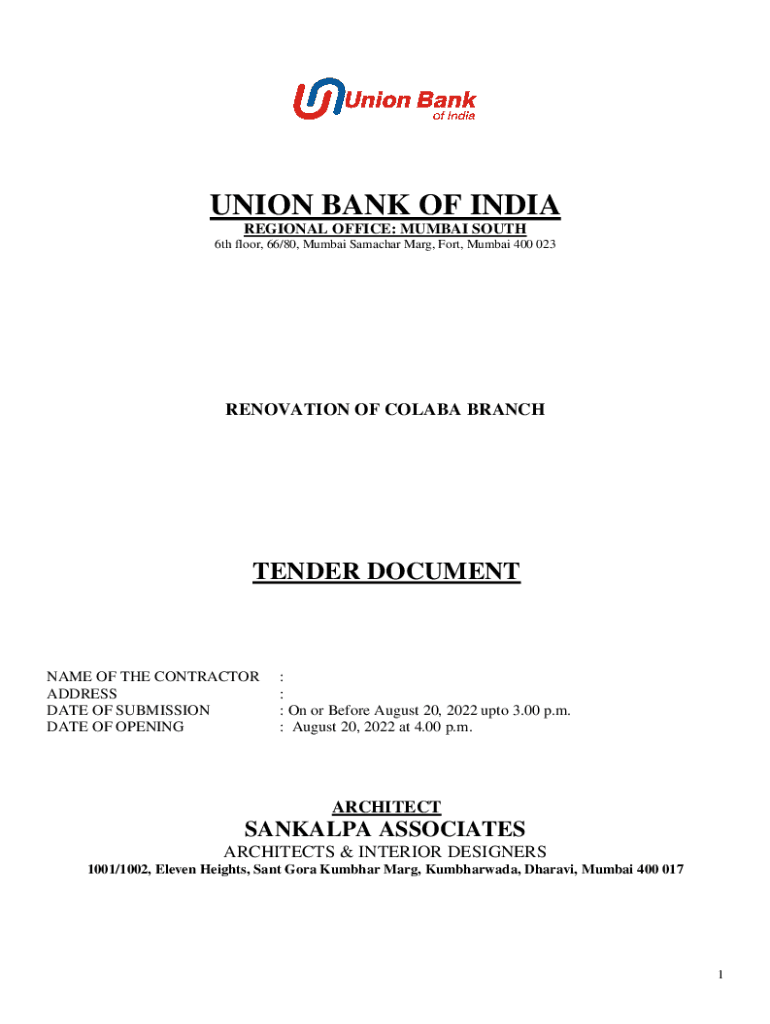 UNION BANK OF INDIA REGIONAL OFFICE: MUMBAI SOUTH 6th floor, 66/80, Mumbai Salazar Mary, Fort, Mumbai 400 023RENOVATION OF COL ABA BRANCHTENDER DOCUMENTARY OF THE CONTRACTOR ADDRESS DATE OF SUBMISSION