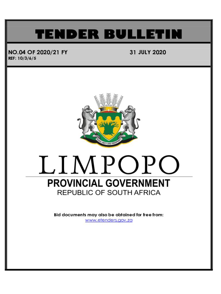 Get the free LIMPOPO PROVINCIAL TENDER BULLETIN NO 04 OF 2020/21 FY, 31 JULY 2020