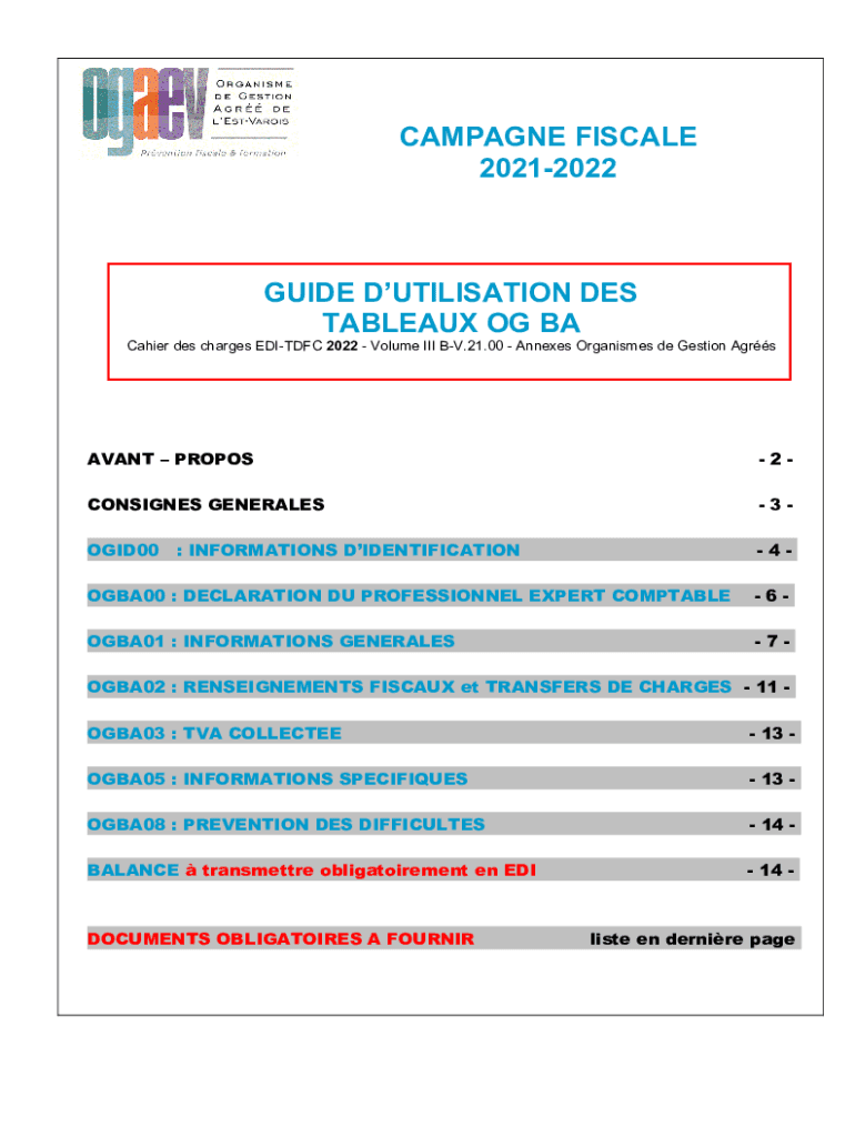 CHAMPAGNE FISCAL 20212022GUIDE UTILIZATION DES TABLEAUX OG BA Cashier DES charges EDITION 2022 Volume III BV.21.00 Annexes Organisms DE Section Savant PROPOS2CONSIGNES GENERALES3OGID004: Information