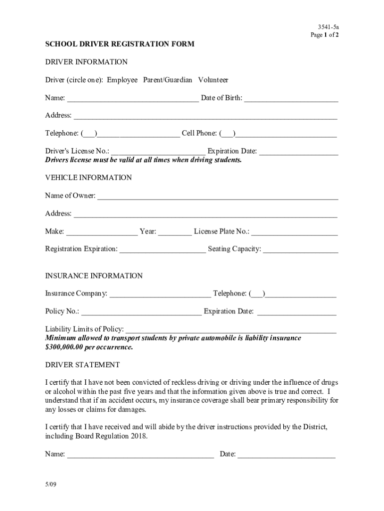 SCHOOL DRIVER REGISTRATION FORM35415a Page 1 of 2DRIVER INFORMATION Driver (circle one): Employee Parent/Guardian Volunteer Name: ___ Date of Birth: ___ Address: ___ Telephone: (___)___ Cell Phone:
