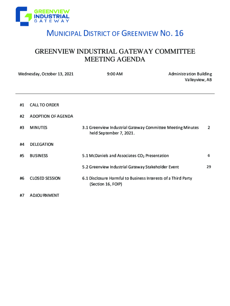 MUNICIPAL DISTRICT OF GLENVIEW NO. 16 GLENVIEW INDUSTRIAL GATEWAY COMMITTEE MEETING AGENDA Wednesday, October 13, 2021#1CALL TO ORDER#2ADOPTION OF AGENDA#3MINUTES#4DELEGATION#5BUSINESS#6CLOSED SESSION#7ADJOURNMENT9:00