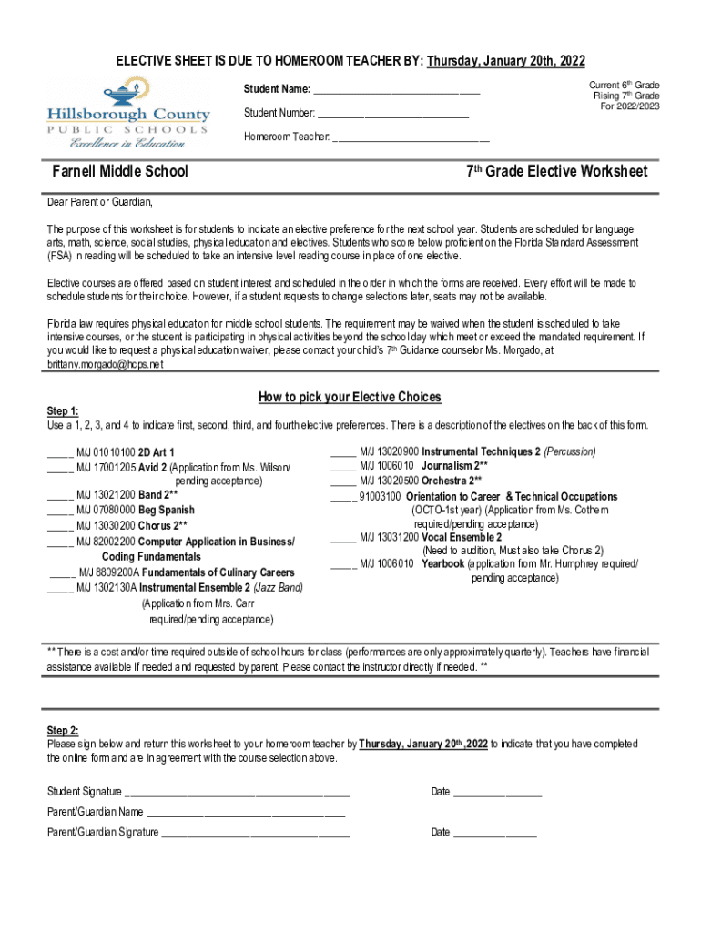 Get the free Farnell Middle School 7th Grade Elective Worksheet