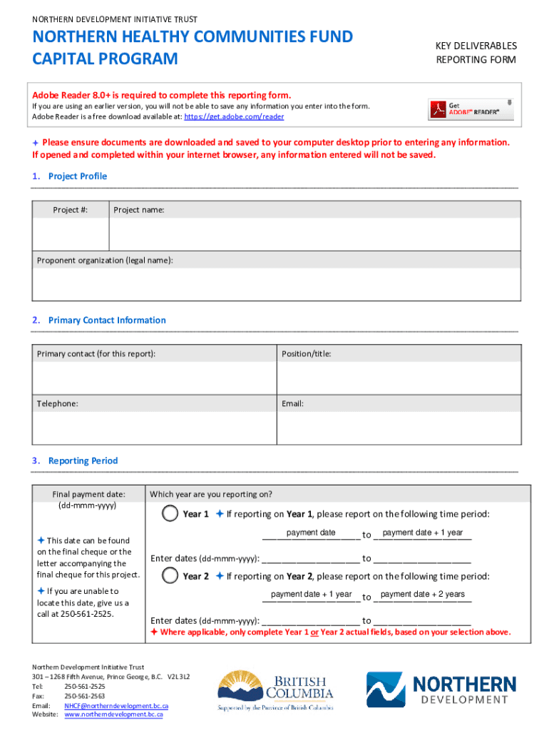 NORTHERN DEVELOPMENT INITIATIVE TRUSTWORTHIER HEALTHY COMMUNITIES FUND CAPITAL PROGRAMMED DELIVERABLES REPORTING Forbade Reader 8.0+ is required to complete this reporting form. If you are using an