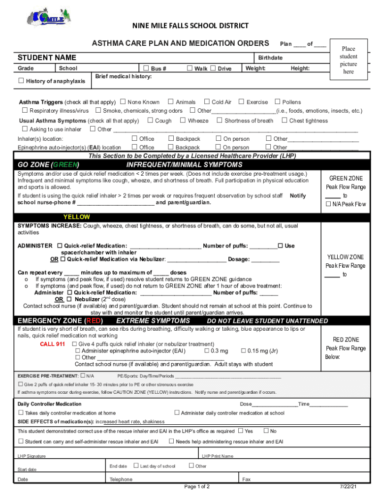 NINE MILE FALLS SCHOOL DISTRICT ASTHMA CARE PLAN AND MEDICATION ORDERS STUDENT NAME Tradesman ___ of ___Birthdate Bus # Brief medical history:School History of anaphylaxis Walk Driveway:Height:Asthma