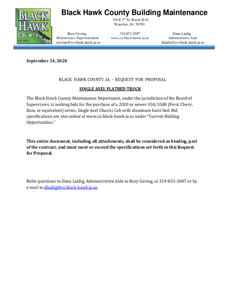 Black Hawk County Building Maintenance 316 E 5th St, Room B41 Waterloo, IA 50703 Rory Giving Maintenance Superintendent rgeving@co.blackhawk.ia.us319.833.3087 www.co.blackhawk.ia.usDana Laid Administrative
