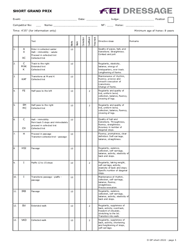 SHORT GRAND PRIX Event: ___ Date: ___ Judge: ___ Position Competitor No:___Name: ___NF: ___ Horse: ___Final mark10Quality of paces, halt, and transitions. Straightness. Contact and poll. C MK Track