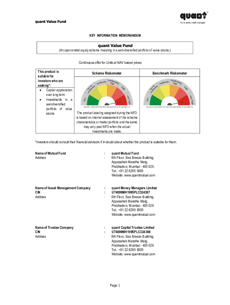 KEY INFORMATION MEMORANDUM(An open-ended equity scheme investing in a well diversified portfolio of value stocks.) Continuous offer for Units at NAV based prices This product is suitable for investors