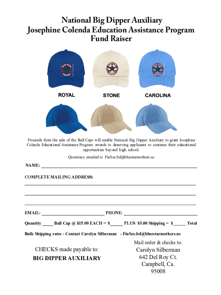 National Big Dipper Auxiliary Josephine Calendar Education Assistance Program Fund RaiserProceeds from the sale of the Ball Caps will enable National Big Dipper Auxiliary to grant Josephine Calendar
