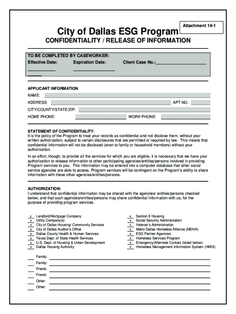 City of Dallas ESG ProgramAttachment 141CONFIDENTIALITY / RELEASE OF INFORMATION TO BE COMPLETED BY CASEWORKER: Effective Date:Expiration Date:Client Case No.:APPLICANT INFORMATION NAME: ADDRESS:APT