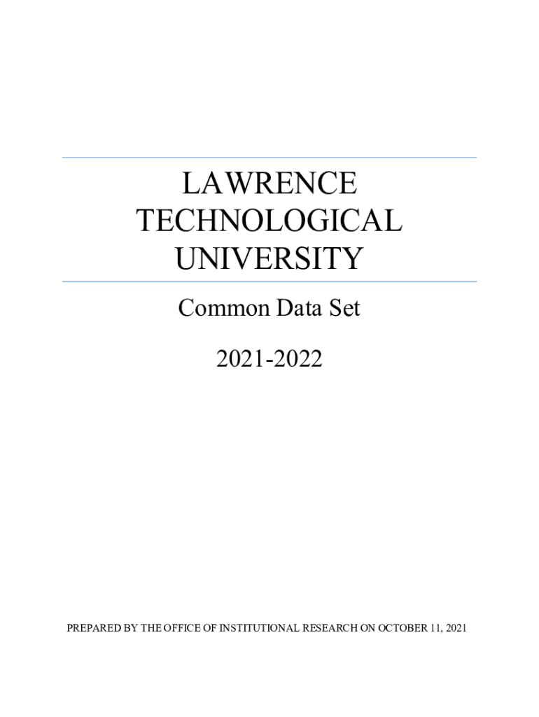 LAWRENCE TECHNOLOGICAL UNIVERSITY Common Data Set 20212022PREPARED BY THE OFFICE OF INSTITUTIONAL RESEARCH ON OCTOBER 11, 2021Lawrence Technological University Common Data Set 2021 2022 Table of Contents.