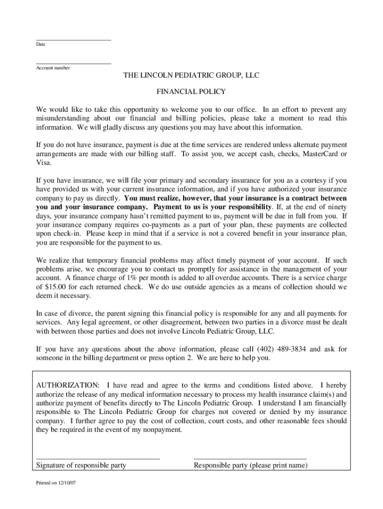 ___ Date___ Account number LINCOLN PEDIATRIC GROUP, LLC FINANCIAL POLICY We would like to take this opportunity to welcome you to our office. In an effort to prevent any misunderstanding about our