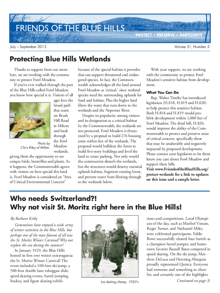 FRIENDS OF THE BLUE HILLS PROTECT PRESERVE PARTICIPATE July September 2013Volume 31, Number 3Protecting Blue Hills Wetlands Thanks to support from our members, we are working with the community to