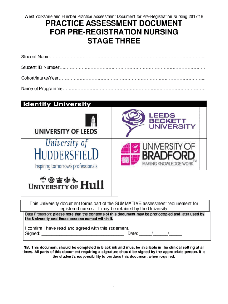 West Yorkshire and Humber Practice Assessment Document for Preregistration Nursing 2017/18PRACTICE ASSESSMENT DOCUMENT FOR PREREGISTRATION NURSING STAGE THREE Student Names... Student ID Number. Cohort/Intake/Year.