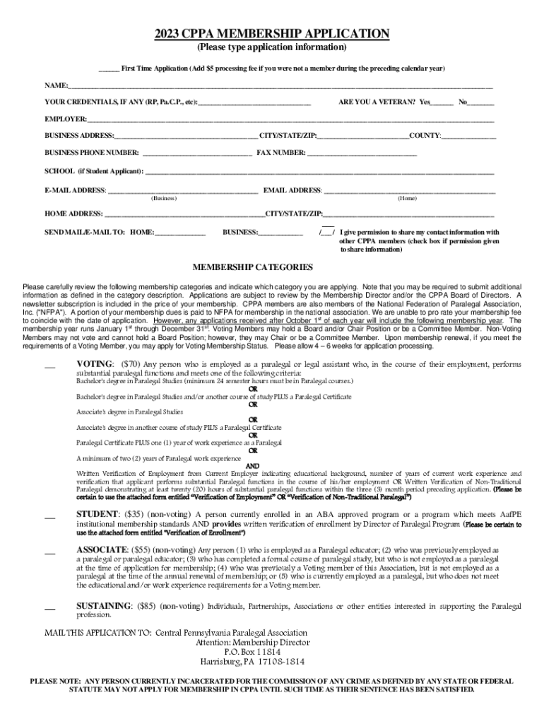 2023 CPA MEMBERSHIP APPLICATION (Please type application information) ___ First Time Application (Add $5 processing fee if you were not a member during the preceding calendar year) NAME:___ YOUR CREDENTIALS,