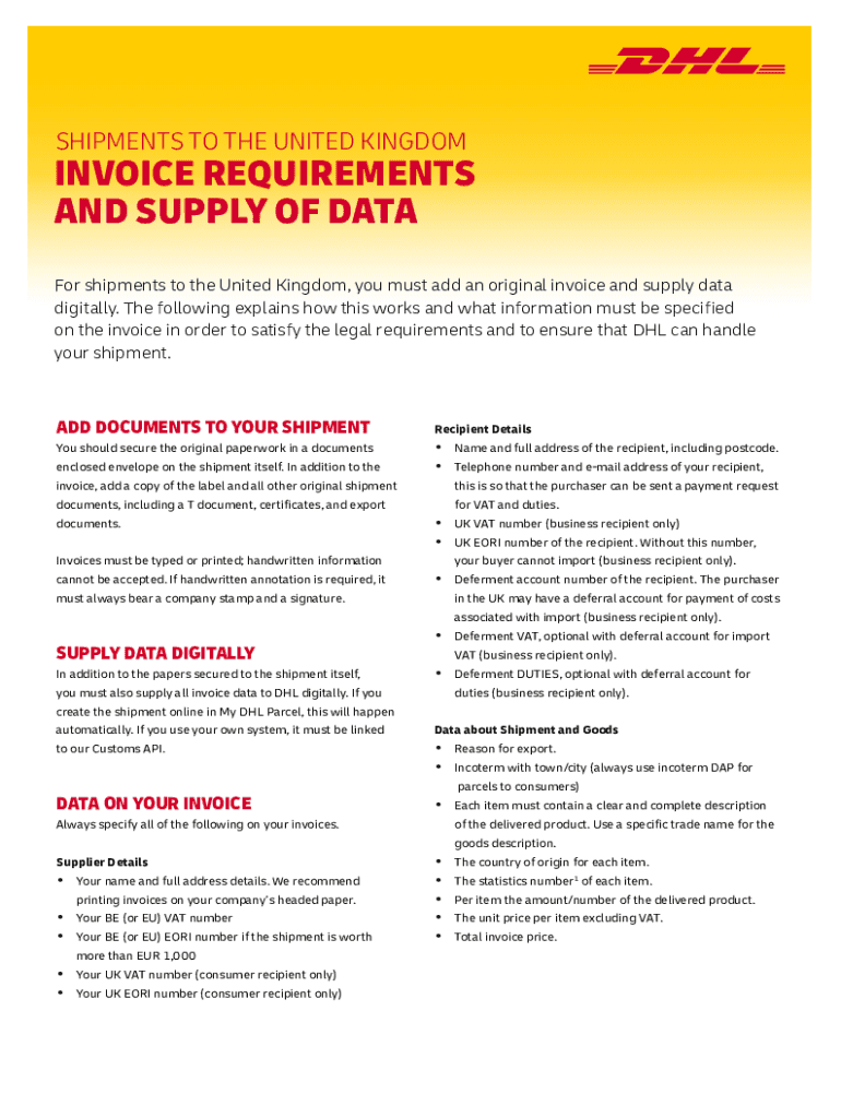 SHIPMENTS TO THE UNITED KINGDOMINVOICE REQUIREMENTS AND SUPPLY OF DATA For shipments to the United Kingdom, you must add an original invoice and supply data digitally. The following explains how this
