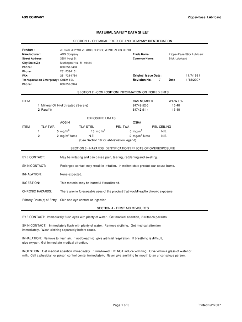 AGS COMPANYZipperEase LubricantMATERIAL SAFETY DATA SHEET SECTION 1 CHEMICAL PRODUCT AND COMPANY IDENTIFICATION Product:ZE2 N/C, ZE2 W/C, ZE2CGC, ZE2CGF, ZE2CS, ZE2IS, ZE2TDManufacturer:AGS Company-wide