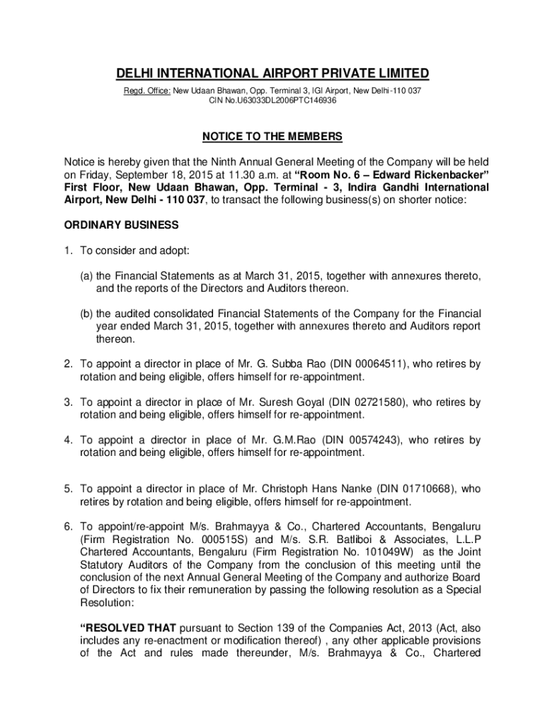 DELHI INTERNATIONAL AIRPORT PRIVATE LIMITED Red. Office: New Urban Shawn, Opp. Terminal 3, IGI Airport, New Delhi110 037 IN No. U63033DL2006PTC146936NOTICE TO THE MEMBERS Notice is hereby given that