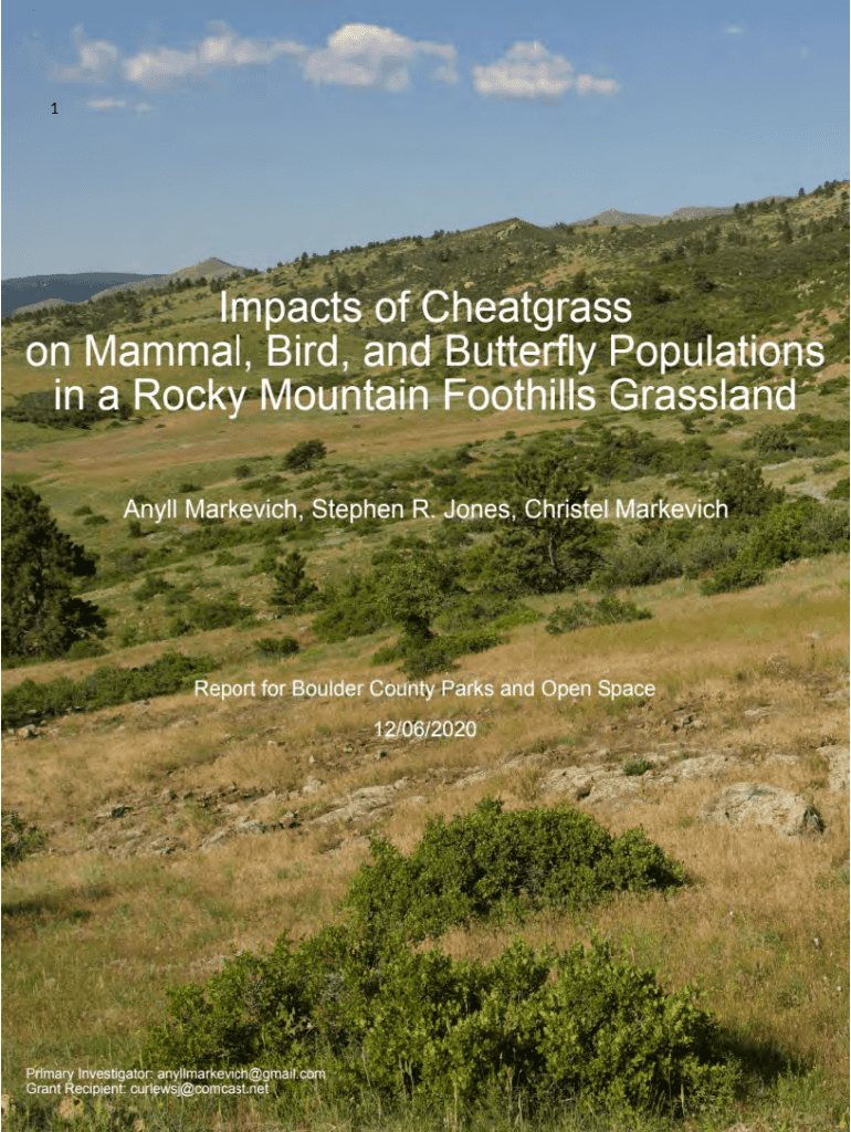 1 1Page 21Executive Summary2 3 4Impacts of Cheat grass on Mammal, Bird, and Butterfly Populations in a Rocky Mountain Foothills5Grassland. Anyll Makovich (Primary Investigator: anyllmarkevich@gmail.com,