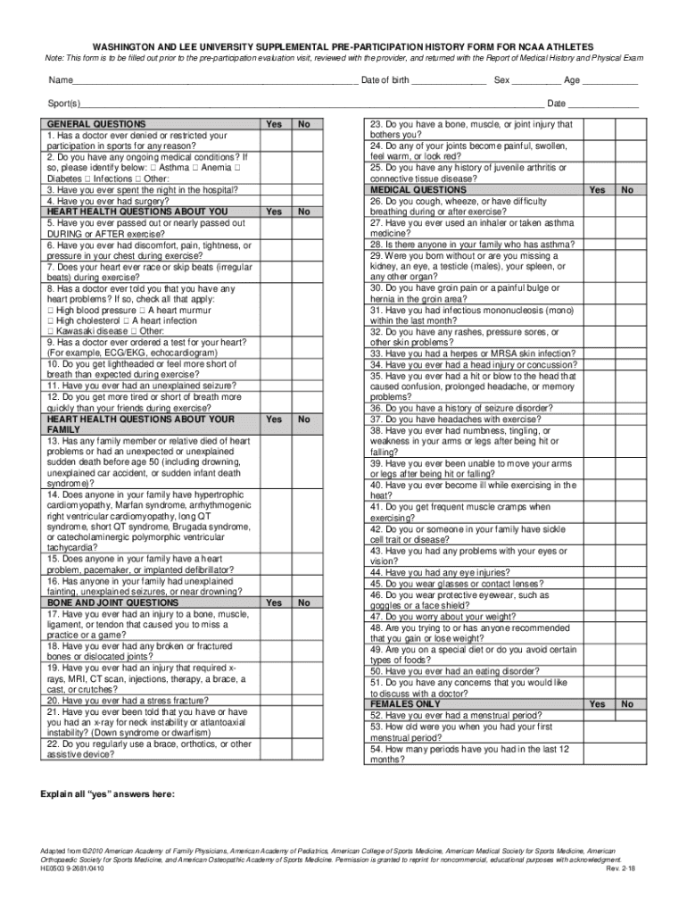 WASHINGTON AND LEE UNIVERSITY SUPPLEMENTAL PARTICIPATION HISTORY FORM FOR NCAA ATHLETES Note: This form is to be filled out prior to the participation evaluation visit, reviewed with the provider,
