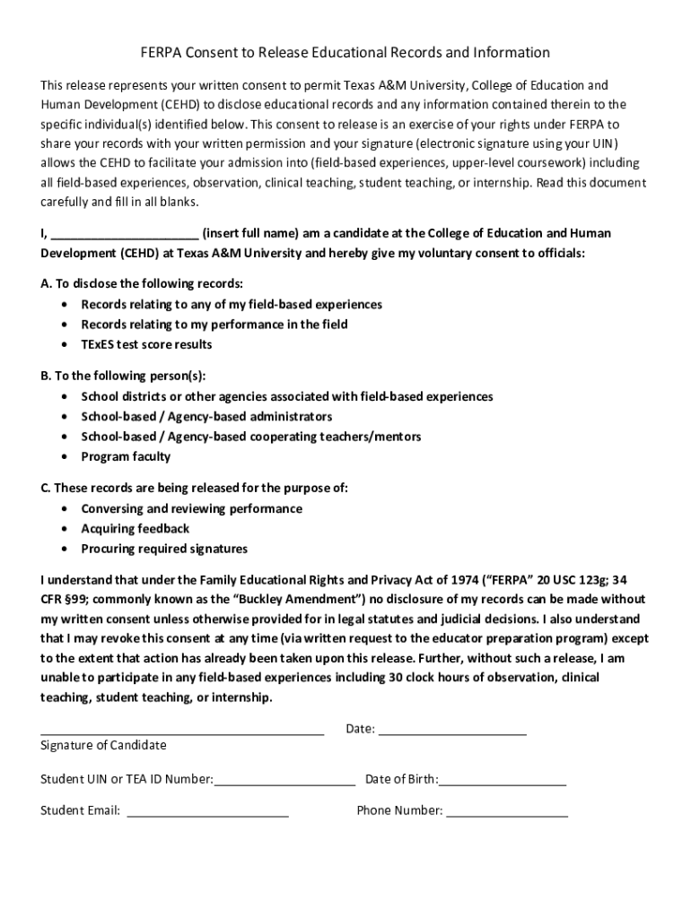 FERPAConsenttoReleaseEducationalRecordsandInformation ThisreleaserepresentsyourwrittenconsenttopermitTexasA&MUniversity, CollegeofEducationand HumanDevelopment(CED)todiscloseeducationalrecordsandanyinformationcontainedthereintothe