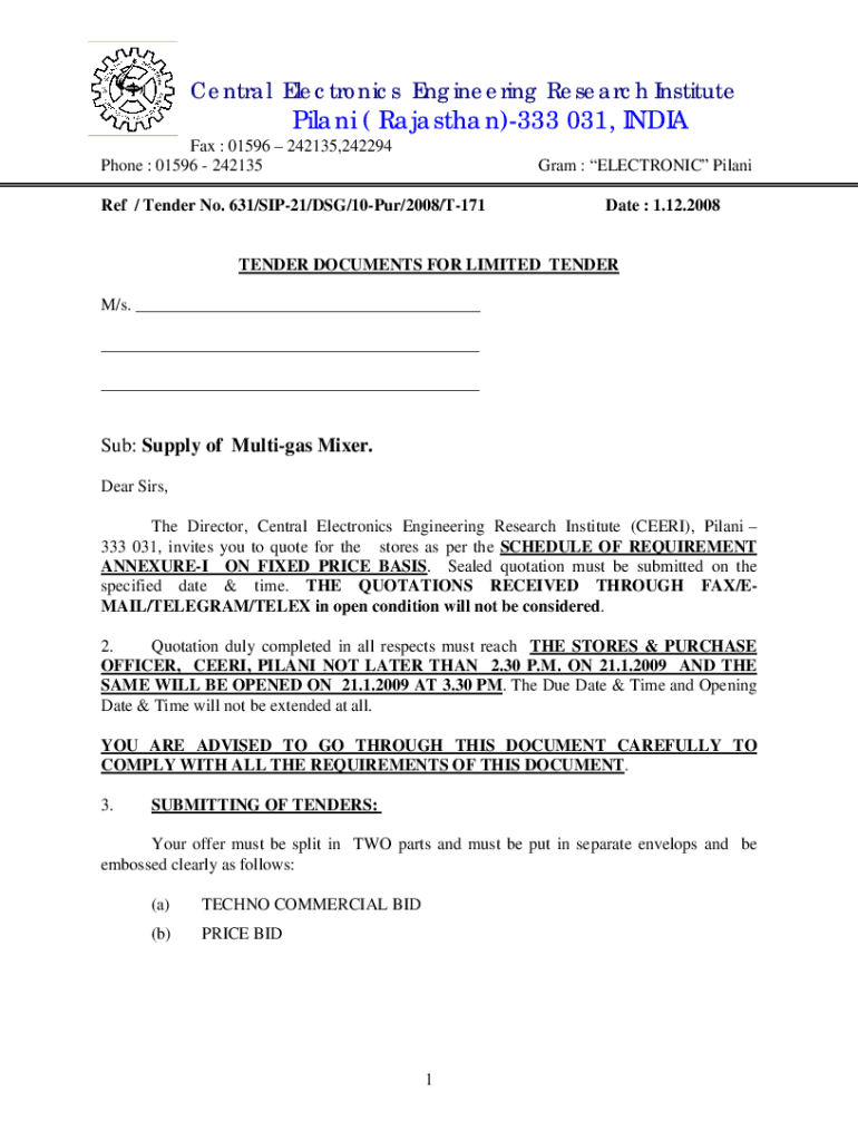 Central Electronics Engineering Research InstitutePilani (Rajasthan)333 031, INDIA Fax : 01596 242135,242294 Phones : 01596 242135Gram : ELECTRONIC PilaniRef / Tender No. 631/SIP21/DSG/10Pur/2008/T171Date
