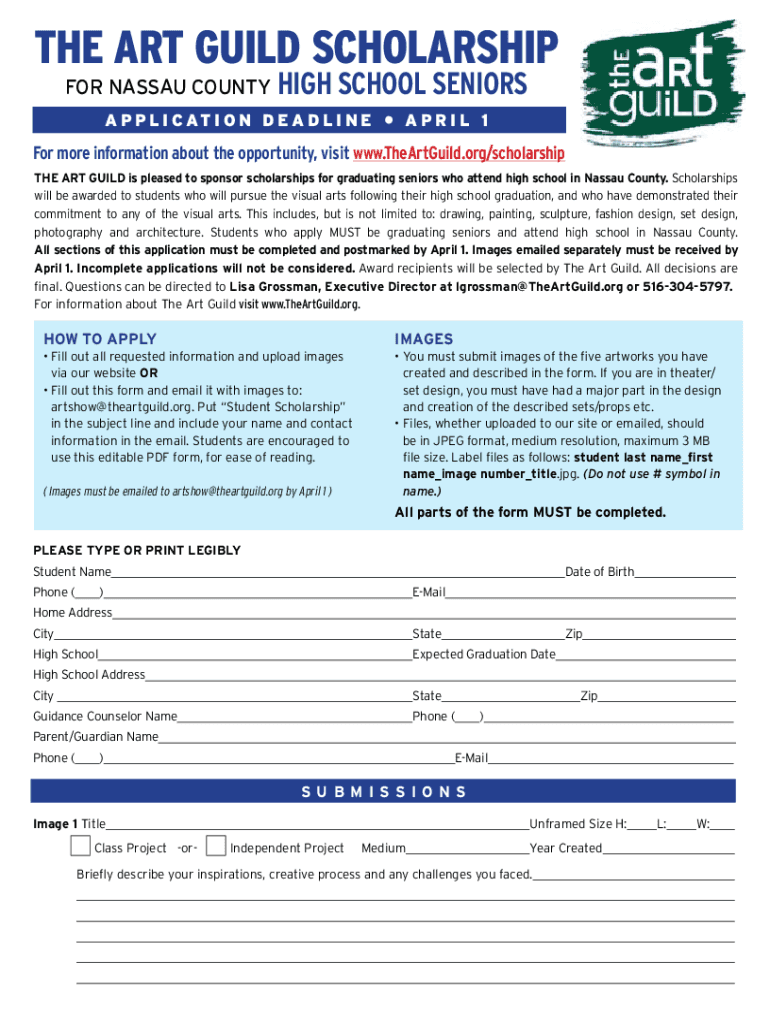 THE ART GUILD SCHOLARSHIP FOR NASSAU COUNTY HIGH SCHOOL SENIORS A P P L I C AT I O N D E A D L I N E A P R I L 1For more information about the opportunity, visit www.TheArtGuild.org/scholarship THE