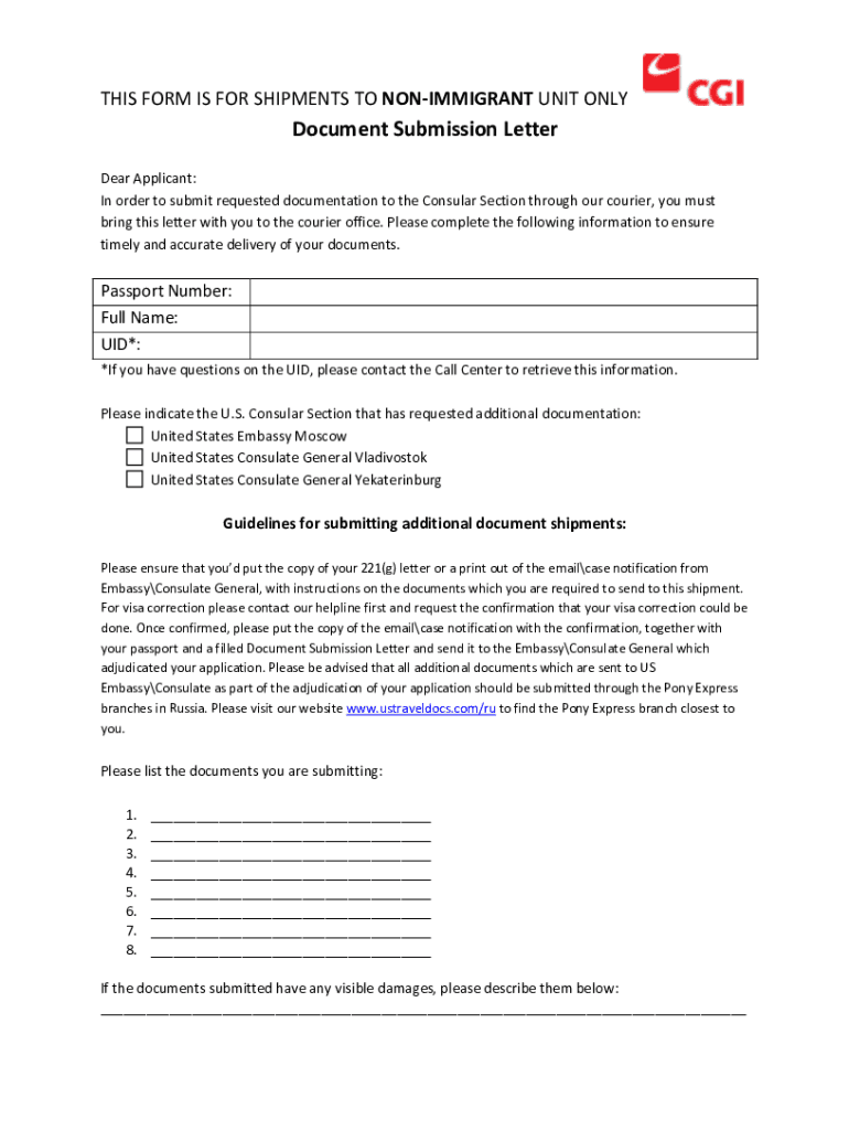 THIS FORM IS FOR SHIPMENTS TO IMMIGRANT UNIT ONLYDocument Submission Letter Dear Applicant: In order to submit requested documentation to the Consular Section through our courier, you must bring this