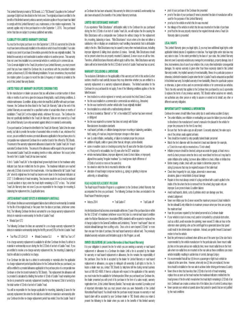 This Limited Warranty is made by TBC Brands, LLC (TBC Brands) & applies to the Cordovan passenger & light truck tires listed on the front cover. The original purchaser is entitled to the benefits