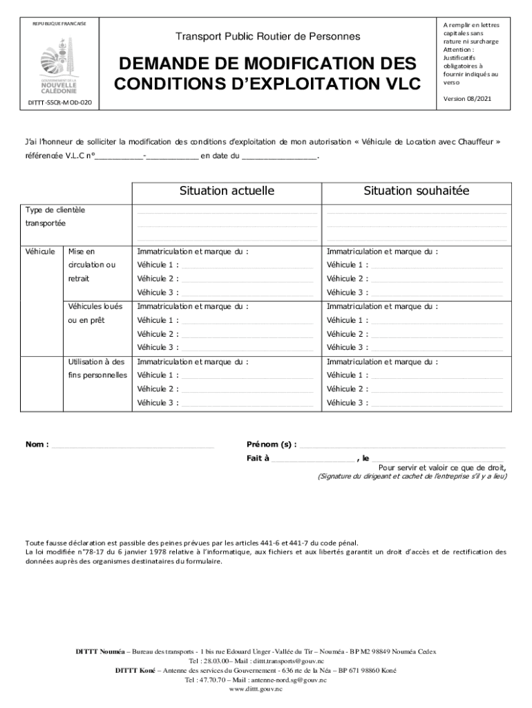 REPUBLICAN FRANCAISETransport Public Router de PersonnesDEMANDE DE MODIFICATION DES CONDITIONS EXPLOITATION VLA repair en letters capitals sans nature NI surcharge Attention : Justification obligations