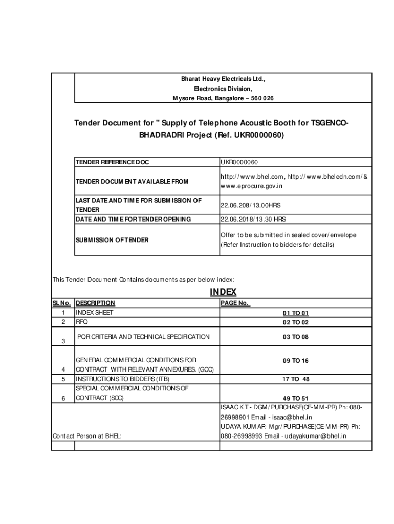 Bharat Heavy Electrical Ltd., Electronics Division, Mysore Road, Bangalore 560 026Tender Document for \” Supply of Telephone Acoustic Booth for TSGENCOBHADRADRI Project (Ref. UKR0000060) TENDER