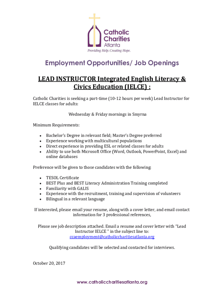 Employment Opportunities/ Job Openings LEAD INSTRUCTOR Integrated English Literacy & Civics Education (HENCE) : Catholic Charities is seeking a part-time (1012 hours per week) Lead Instructor for