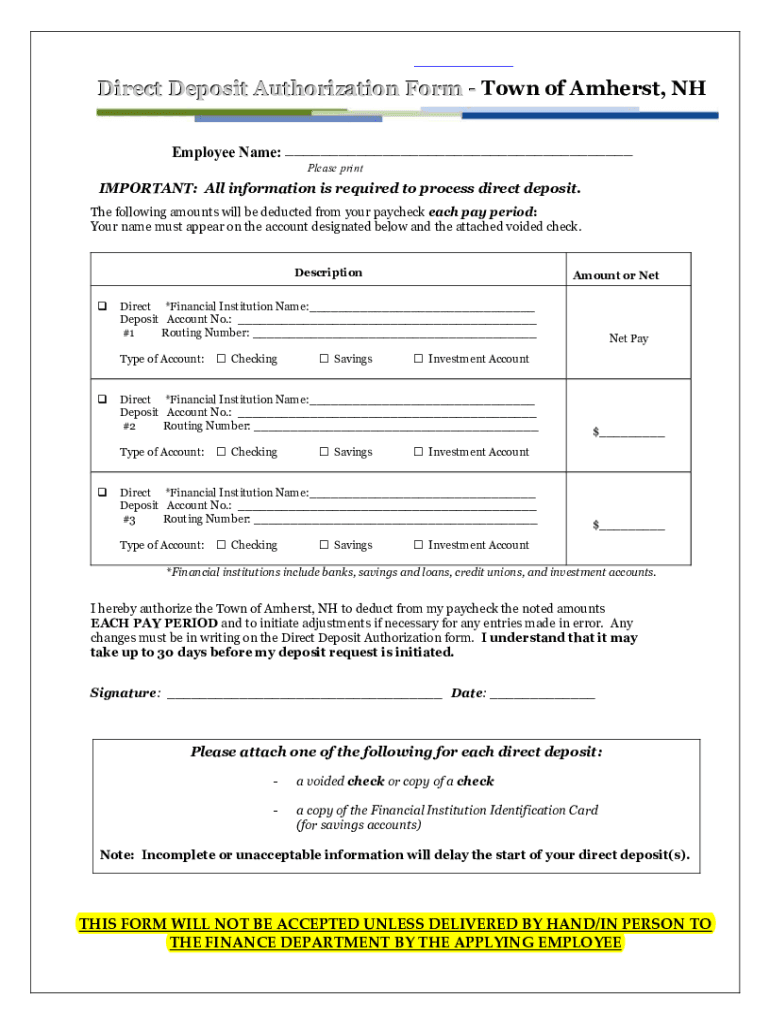 Direct Deposit Authorization Form Town of Amherst, NH Employee Name: ___ Please printIMPORTANT: All information is required to process direct deposit. The following amounts will be deducted from your