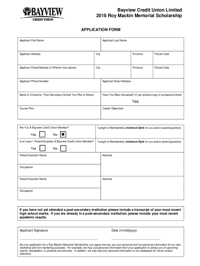 Bayview Credit Union Limited 2018 Roy Mac kin Memorial ScholarshipINVESTING IN A BRIGHT FUTURE FOR OUR YOUNG PEOPLE FOUR SCHOLARSHIPS OF $1000 EACH Roy Mac kin was the Chief Executive Officer of Bayview
