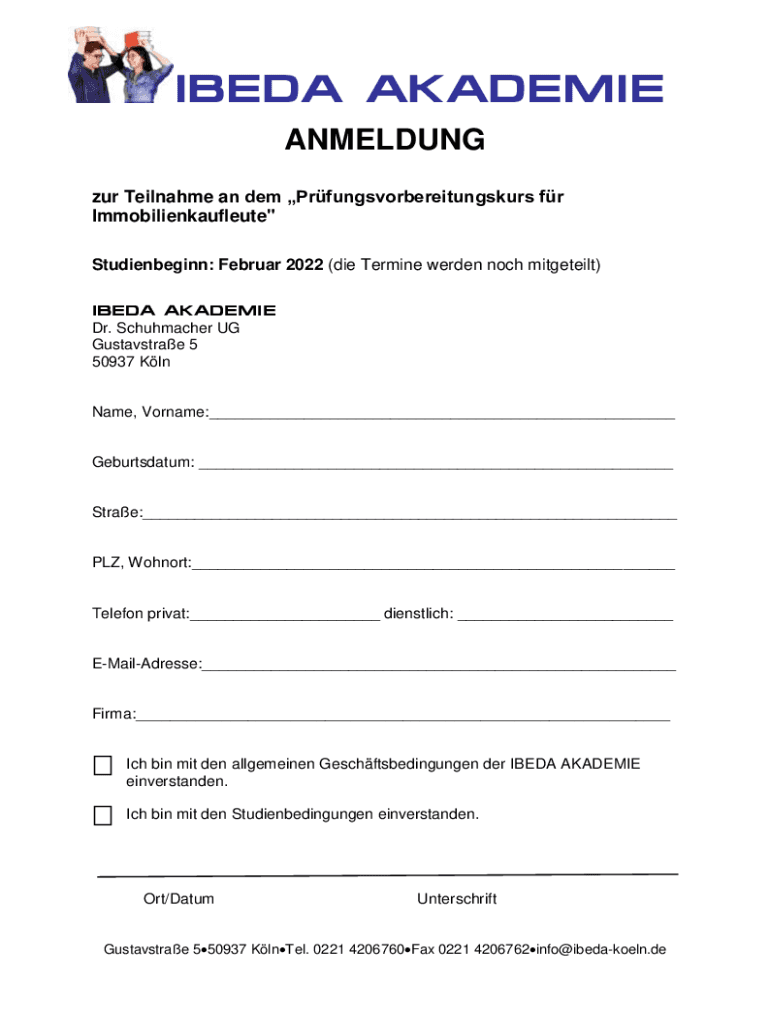IBE DA ACADEMIC AMENDING our Mallarme a Prfungsvorbereitungskurs for Immobilienkaufleute\” Studienbeginn: February 2022 (die Termini warden Noah mitgeteilt) IBE DA ACADEMIC Dr. Schumacher UG Gustavstrae