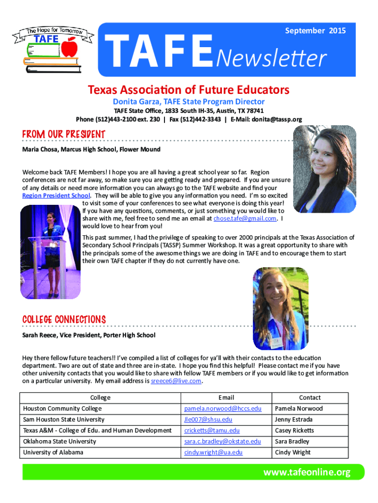 September 2015TAFENewsletter Texas Association of Future Educators Bonita Garza, TAKE State Program Directorate State Office, 1833 South IH35, Austin, TX 78741 Phone (512)4432100 ext. 230 | Fax (512)4423343