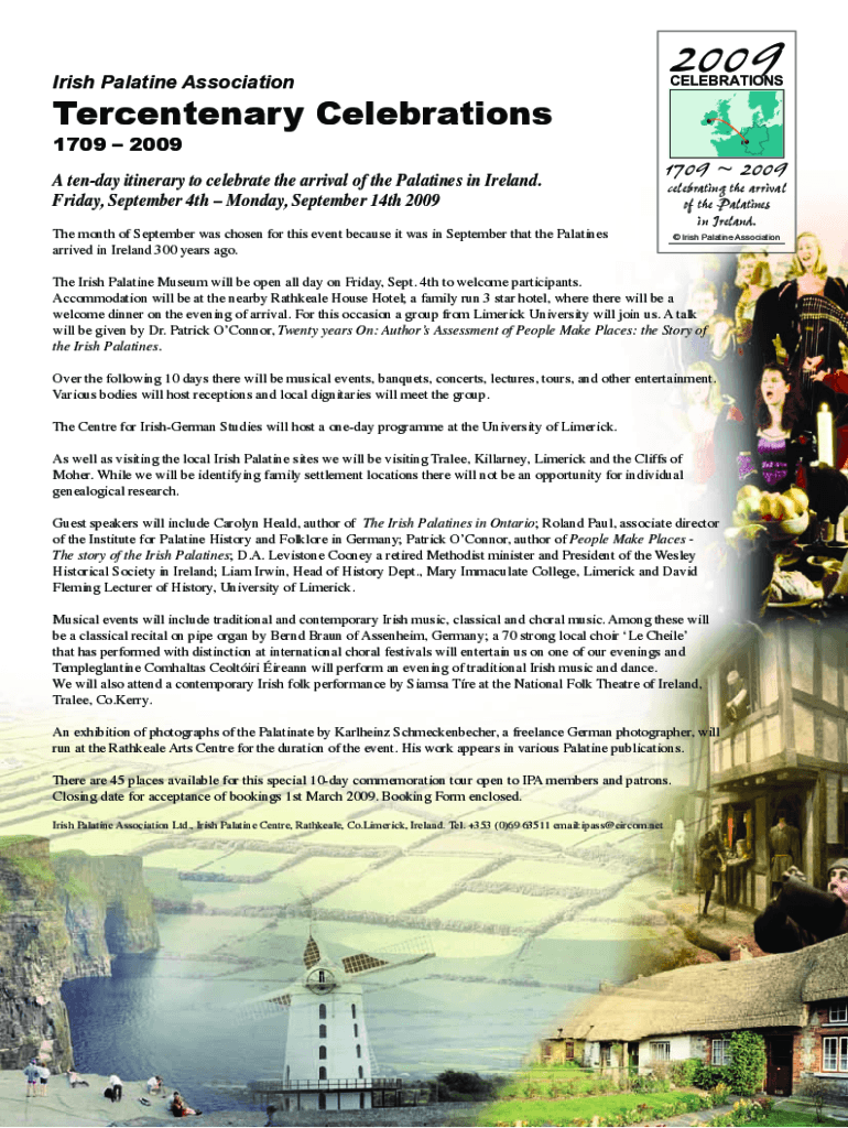 Irish Palatine Association2009 CELEBRATIONSTercentenary Celebrations 1709 2009 A ten-day itinerary to celebrate the arrival of the Palatines in Ireland. Friday, September 4th Monday, September 14th