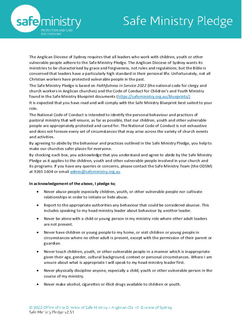 The Anglican Diocese of Sydney requires that all leaders who work with children, youth or other vulnerable people adhere to the Safe Ministry Pledge. The Anglican Diocese of Sydney wants its ministries