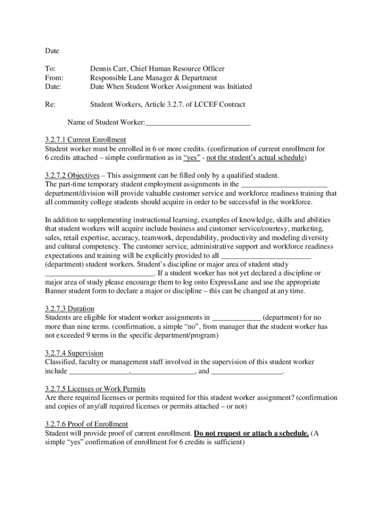 Date To: From: Date:Dennis Carr, Chief Human Resource Officer Responsible Lane Manager & Department Date When Student Worker Assignment was Initiated Re:Student Workers, Article 3.2.7. Of CCEF Contract