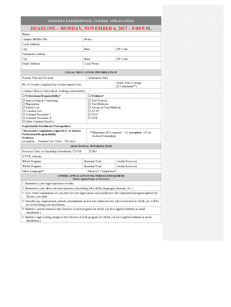 STUDENT EXPERIENTIAL COURSE APPLICATIONDEADLINE MONDAY, NOVEMBER 6, 2017 5:00 P.M. Name: Campus Mailbox No.:Phone:Local Address: City:State:ZIP Code:City:State:ZIP Code:Email Address:Local Phone:Permanent