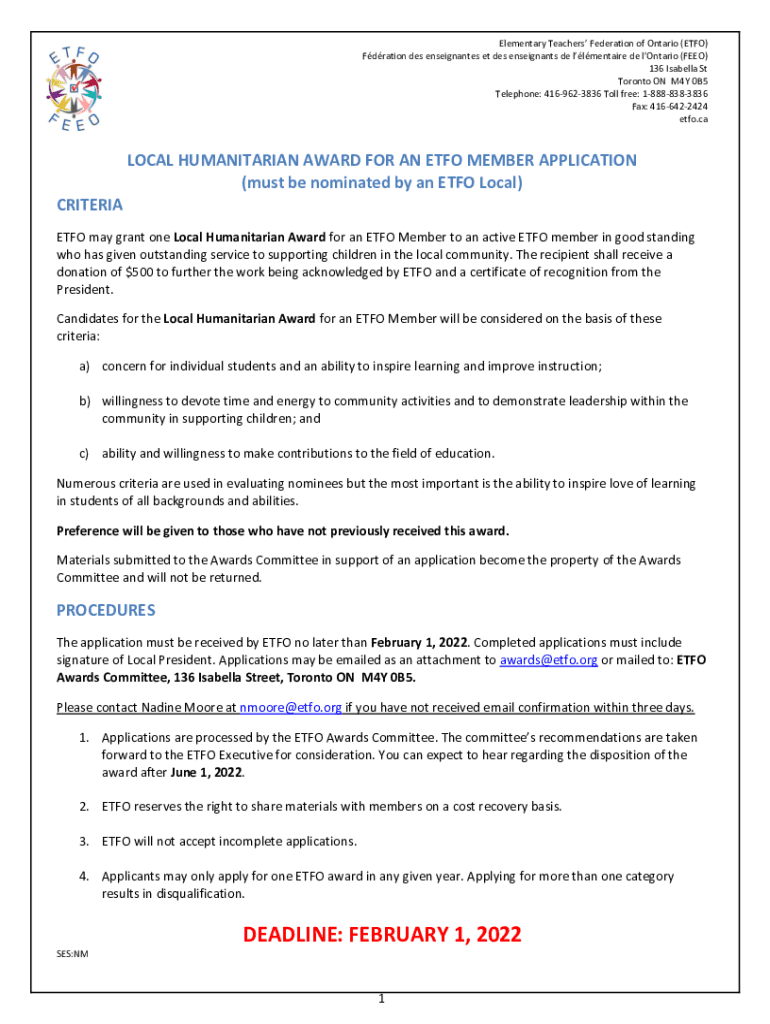 Elementary Teachers Federation of Ontario (ETF) Formation DES enseignantes et DES enseignants de lamentable de Ontario (FEET) 136 Isabella St Toronto ON M4Y 0B5 Telephone: 4169623836 Toll free: 18888383836