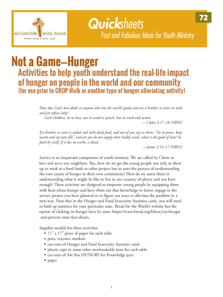 Not a GameHungerActivities to help youth understand the real life impact of hunger on people in the world and our community (for use prior to CROP Walk or another type of hunger alleviating activity)