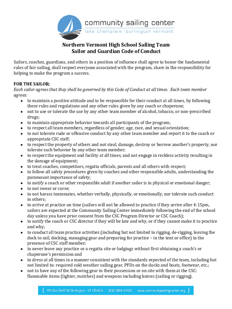 Northern Vermont High School Sailing Team Sailor and Guardian Code of Conduct Sailors, coaches, guardians, and others in a position of influence shall agree to honor the fundamental rules of fair