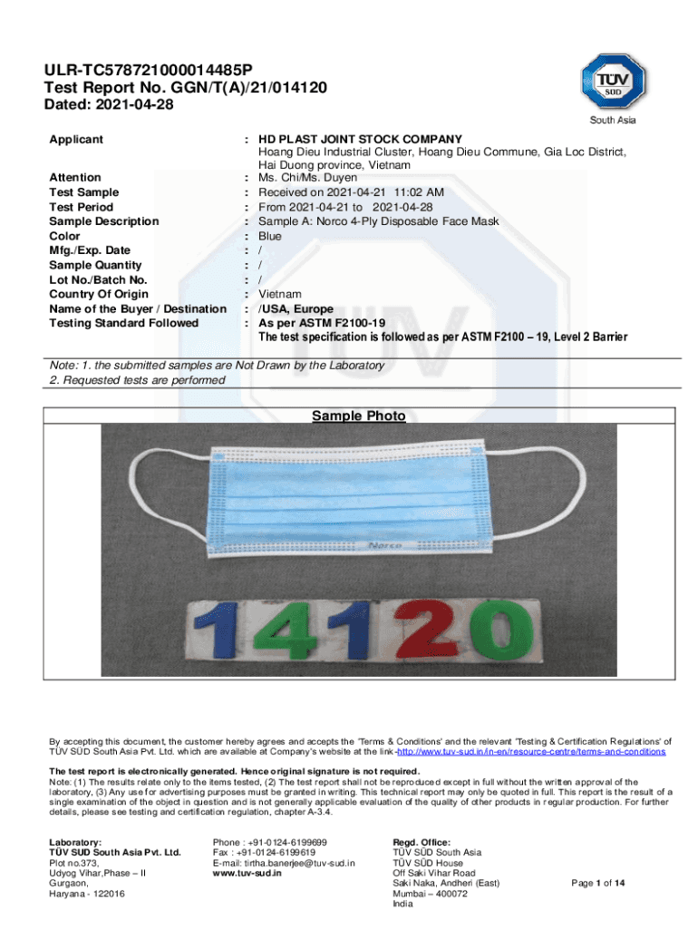 ULRTC578721000014485P Test Report No. GUN/T(A)/21/014120 Dated: 20210428 Applicant Attention Test Sample Test Period Sample Description Color Mfg./Exp. Date Sample Quantity Lot No./Batch No. Country